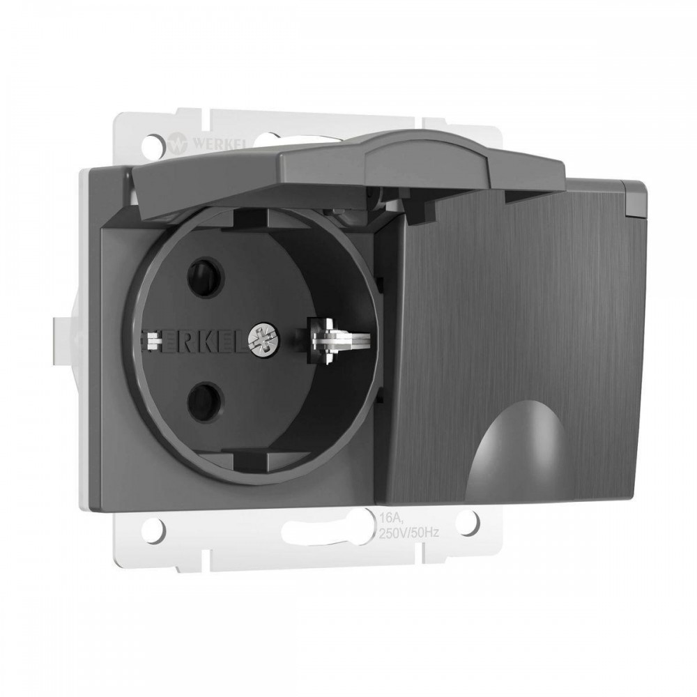 W1171264 Розетка двойная влагозащищенная с заземлением с защитной крышкой и шторками графит рифленый