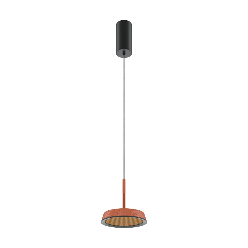 Металлический корпус, цветовая палитра - черный, белый, золото и терракотовый. Два вида плафонов: «таблетка» с графичным рельефом из ассиметричных линий; «таблетка» + идеально-гладкая металлическая «тарелка». Дизайн вдохновлен супрематической эстетикой. LED-источник света, цветовая температура - 3000К. Регулируемый провод - 3 метра.