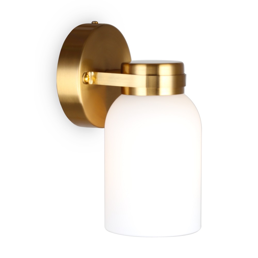 Арматура из металла. Цвет латунь. Плафоны из белого стекла новой необычной формы. Два варианта светильников — потолочные и бра. Подходит для помещений с низкими потолками. Источник света — лампа. Цоколь E14.