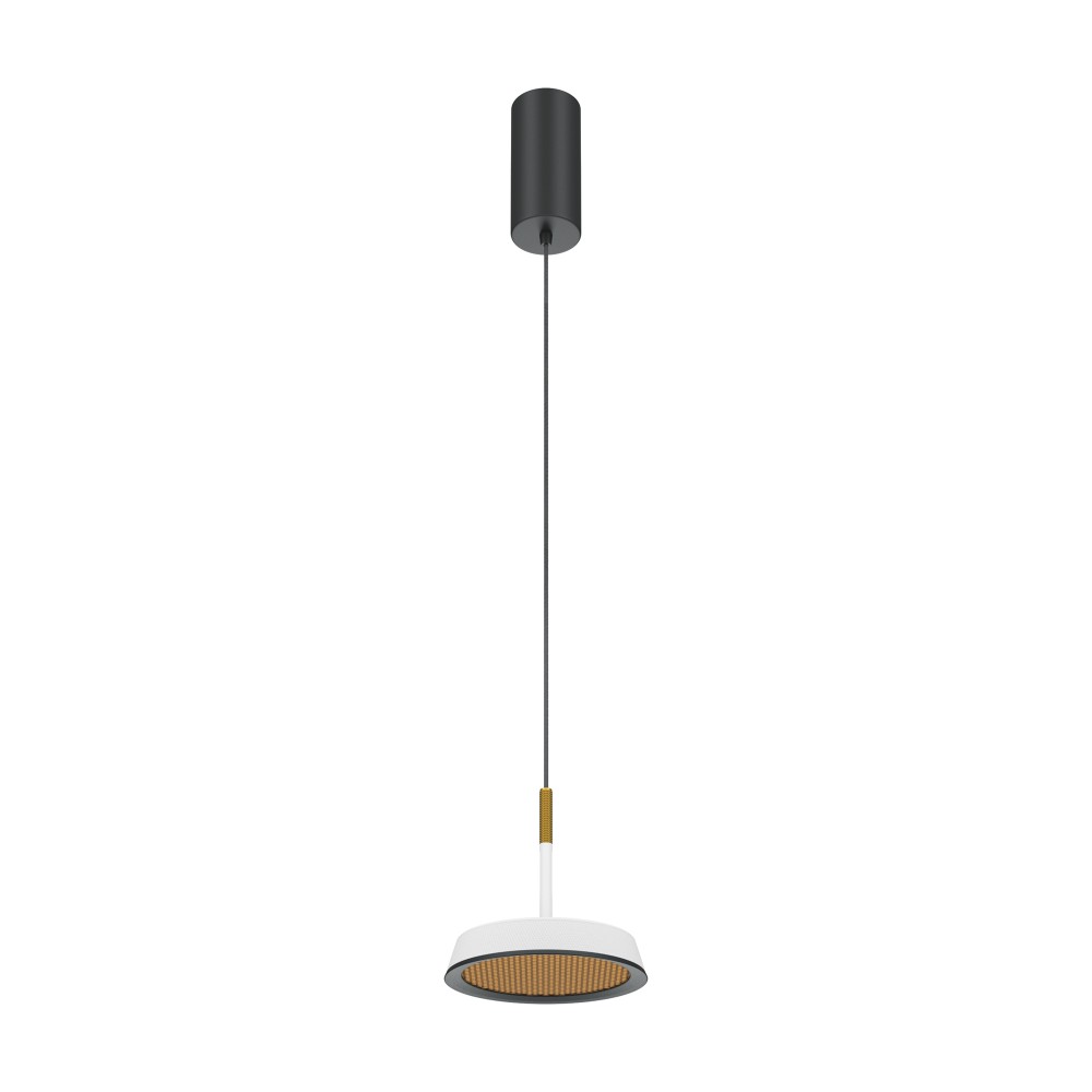 Металлический корпус, цветовая палитра - черный, белый, золото и терракотовый. Два вида плафонов: «таблетка» с графичным рельефом из ассиметричных линий; «таблетка» + идеально-гладкая металлическая «тарелка». Дизайн вдохновлен супрематической эстетикой. LED-источник света, цветовая температура - 3000К. Регулируемый провод - 3 метра.