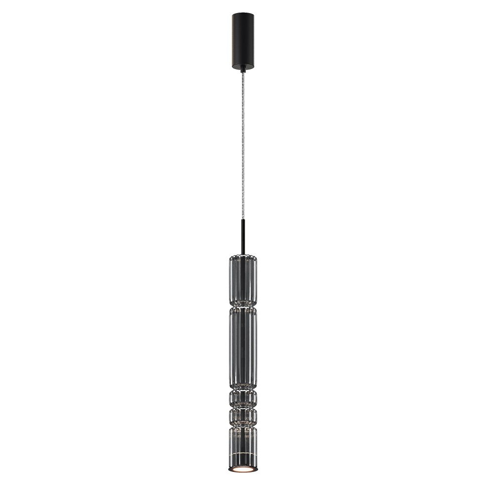 Арматура - металл, цвет - хром, латунь, черный. Цилиндрические плафоны из стекла с вертикальным рельефным рисунком в трех оттенках: прозрачный, коньячный, дымчатый. Метафора древнегреческих храмовых колонн в образе светильников. LED-источник света. Цветовая температура 3000К.