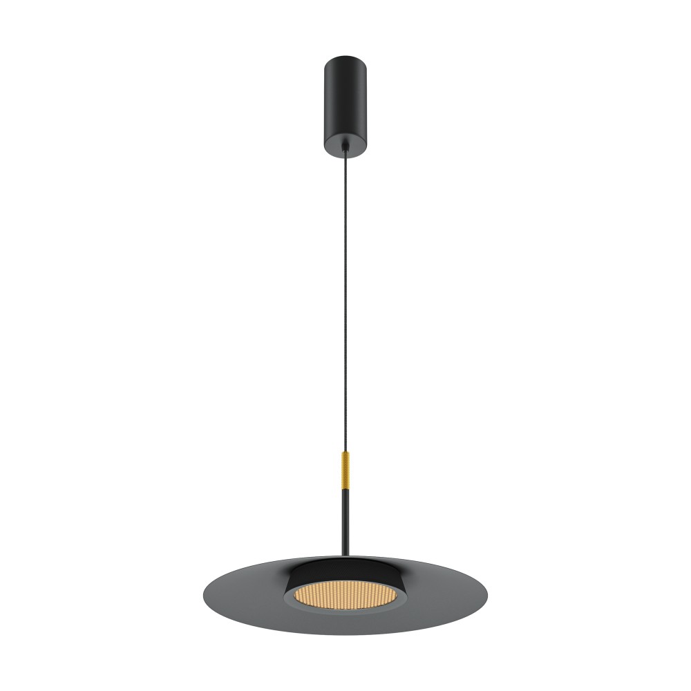 Металлический корпус, цветовая палитра - черный, белый, золото и терракотовый. Два вида плафонов: «таблетка» с графичным рельефом из ассиметричных линий; «таблетка» + идеально-гладкая металлическая «тарелка». Дизайн вдохновлен супрематической эстетикой. LED-источник света, цветовая температура - 3000К. Регулируемый провод - 3 метра.