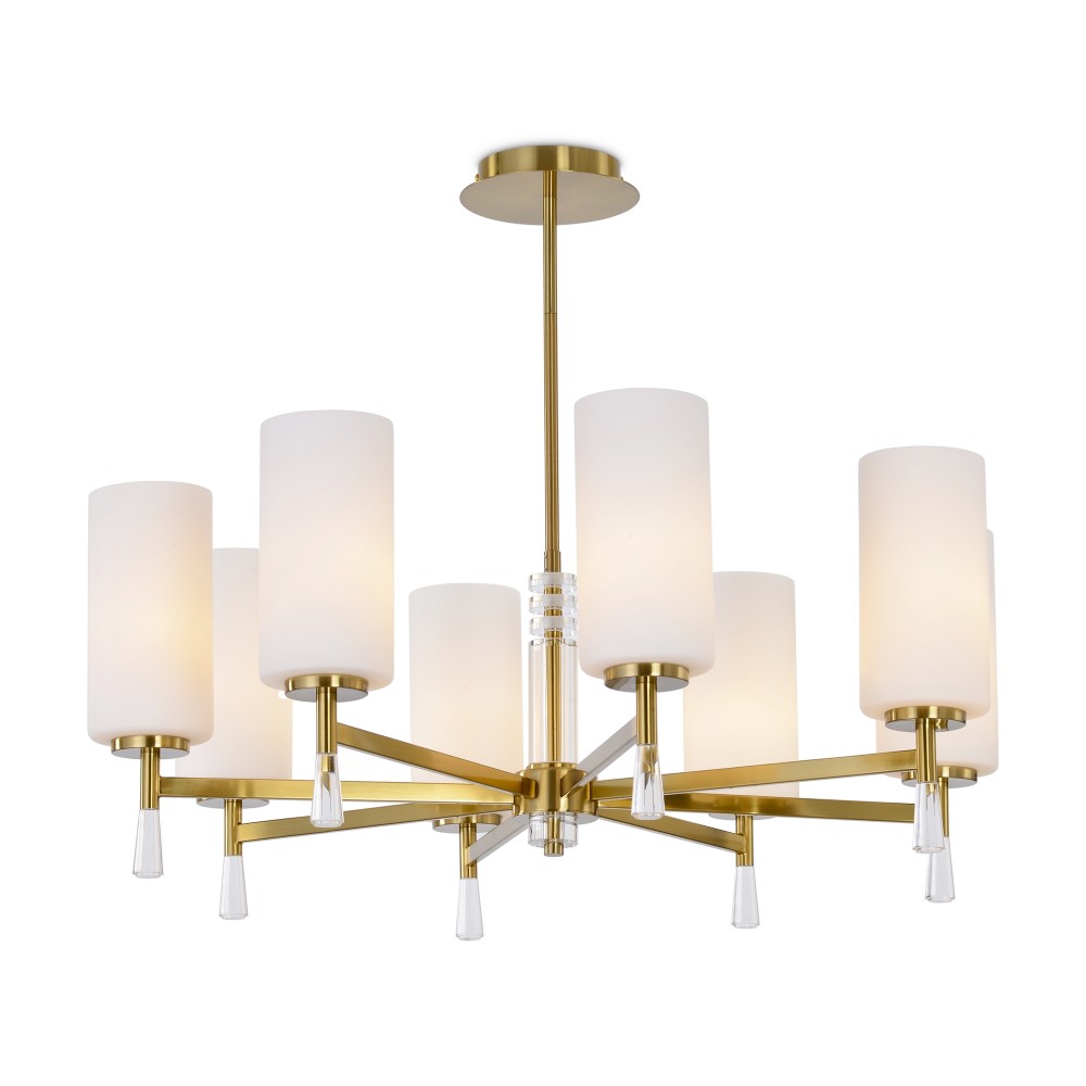 Арматура металл. Цвет латунь. Стеклянные белые плафоны хорошо рассеивают свет, направлены вверх, тем самым вытягивают потолок. Декоративные элементы в виде хрустального основания и капель из акрила. Источник света — лампа. Цоколь E27.