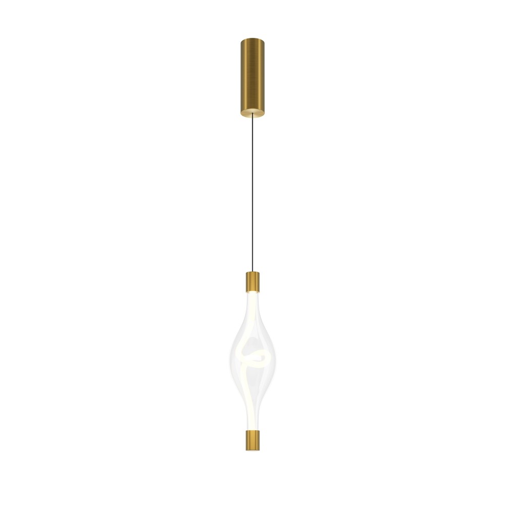 Арматура из металла в цвете латуни, плафоны — прозрачное стекло. LED-источник света в виде светодиодного тканевого шнура, цветовая температура 3000К и угол рассеивания 360°. Трендовая форма петли светодиодного шнура. Тросы подвесов регулируются по высоте до трех метров. Могут использоваться как основной источник света.