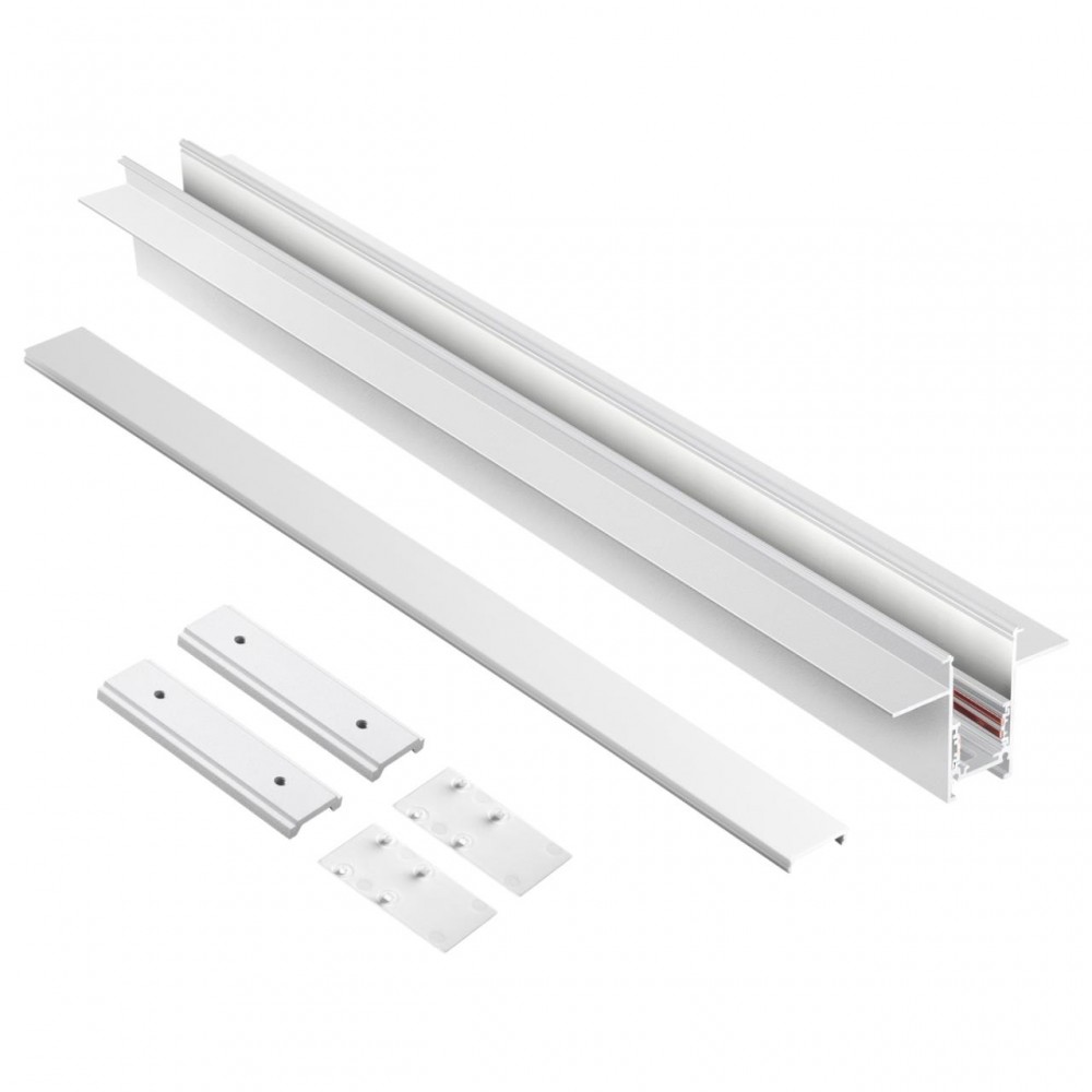 Шинопровод FLUM для монтажа в ГКЛ высотой 12мм. Длина шинопровода 2 метра, в комплект к нему входят две заглушки, два прямых соединителя и крышка из пластика.