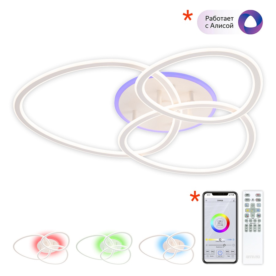 * Опционально: при установке дополнительного смарт-модуля Citilux CLR1M (не входит в комплект, приобретается отдельно) светильник становится УМНЫМ /(Citilux SMART).Используя сеть Wi-Fi, при наличии интернет-соединения, можно полноценно управлять всеми режимами работы светильника из приложения Citilux Smart со смартфона или планшета, а также с помощью голосовых помощников