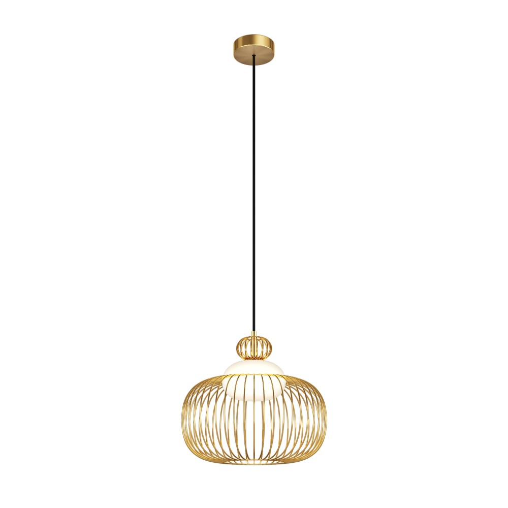 Цвет арматуры — латунь. Материал арматуры — металл. Абажур — каркас из проволоки, стекло. Оригинальный дизайн с эффектом левитации. Стеклянный рассеиватель со специальным выступом для крепления проволочного плафона. Два типа подвесных светильников: компактные со сменными лампами и крупный с LED-модулем для двунаправленного освещения. Провод длиной 3 метра для высоких потолков. Регулируемая высота подвеса. Универсальный дизайн для неоклассики, эклектики и фьюжн.
