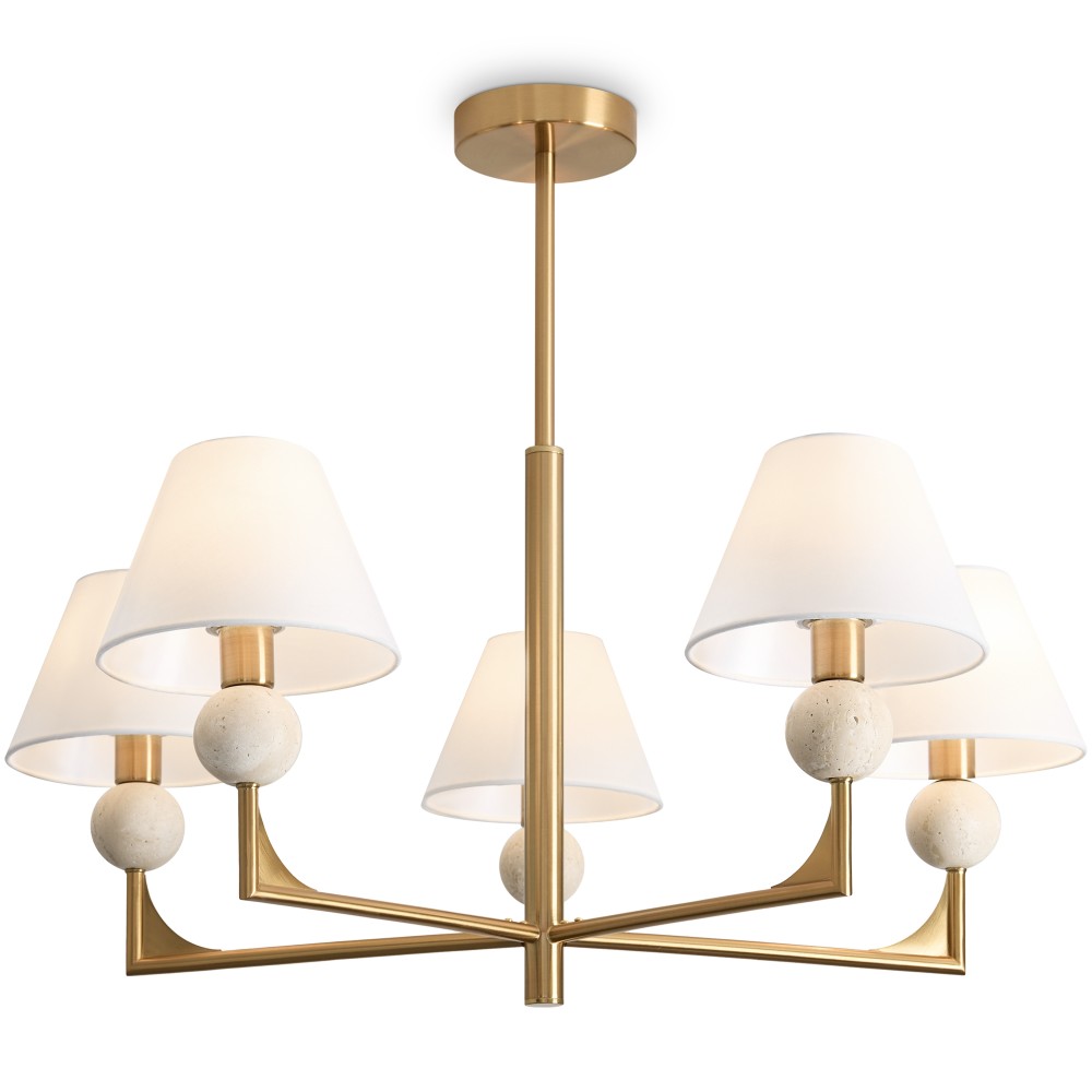 Материал арматуры — металл. Цвет металла — латунь. Абажуры выполнены из белой ткани, которые мягко рассеивают свет. Потолочные и настенные светильники с цоколем E14. Декоративные элементы в форме шара на плафоне выполнены из травертина. Металлическая форма арматуры строгой геометрической формы с пластинами из латуни. Подходит для оформления элегантных классических пространств.
