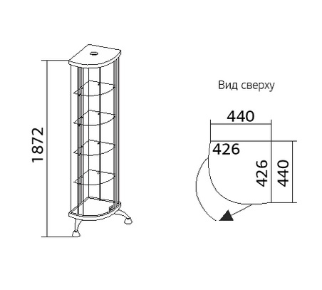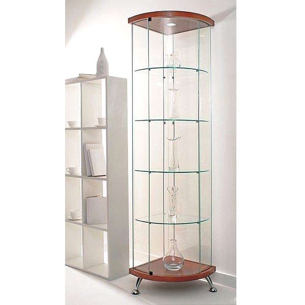 კუთხის ვიტრინა მოხრილი კარით, ფეხებზე, შესაფერისი თქვენი კოლექციების განთავსებისთვის, გამოიყენება საქონლის მოსაწყობად, სასტუმროებში, მაღაზიებში.