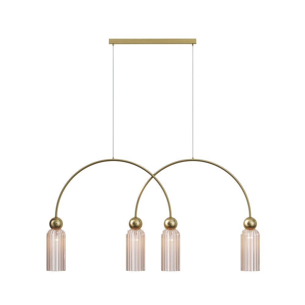 Металлическая арматура в цвете золота. Плафоны стеклянные нескольких цветов: коньячный, дымчатый, белый, серый. Источник света: цоколь Е14. Высота регулируется сегментами штанги или с помощью трехметрового провода. Серия применима в помещениях с высокими потолками. Поверхность стеклянных плафонов рифленая, усиливающая световые эффекты.