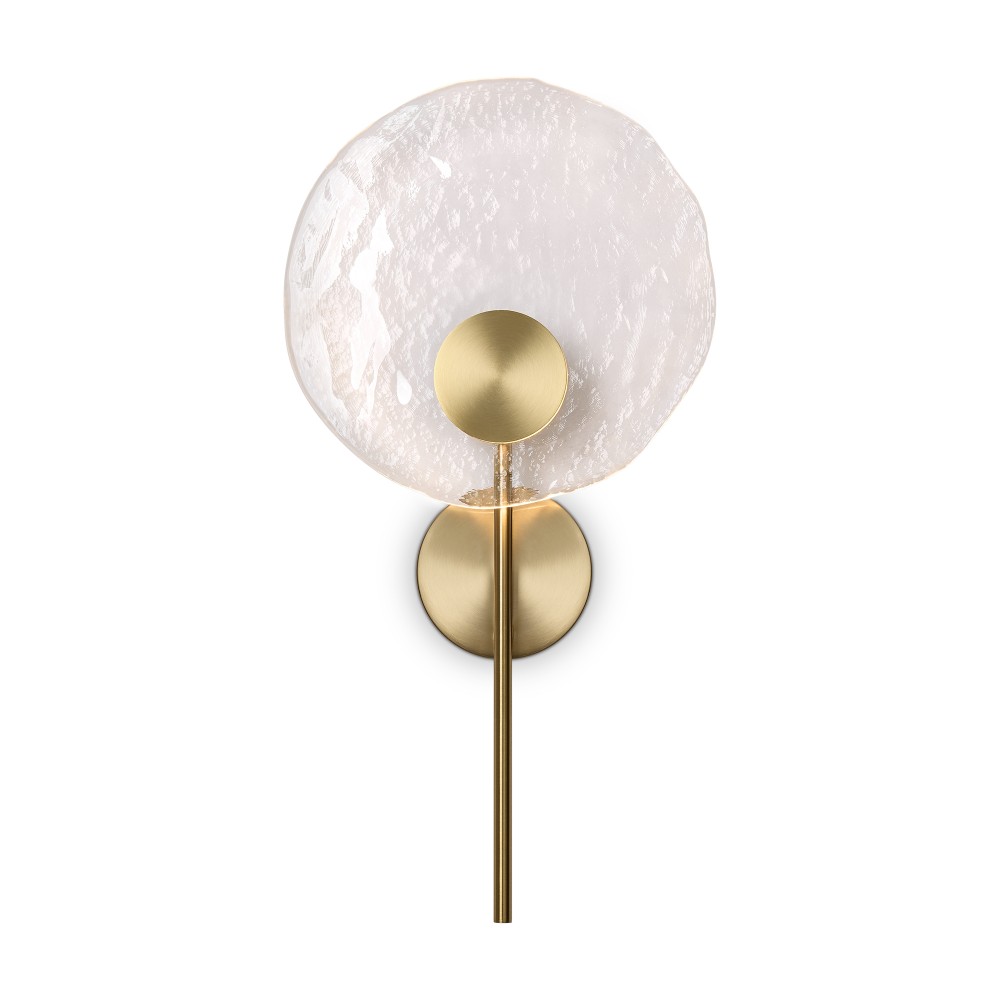 Материал арматуры — металл, цвет — латунь. Настенные светильники оснащены LED-источником света с цветовой температурой 2700К. Уникальное стекло ручного производства обеспечивает равномерное свечение всей поверхности плафона. Для достижения наилучшего светового эффекта рекомендуется использовать в сочетании с основными источниками света.